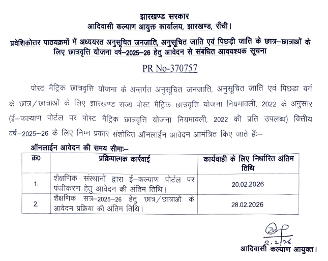 | Available Categories | – Pre-Matric Scholarship – Post-Matric (Within Jharkhand) – Post-Matric (Outside Jharkhand) |